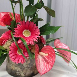 We’ll guide you through creating a bold and elegant corporate floral arrangement using a monochromatic palette of cerise pinks. You’ll learn how to work with eco-friendly fibre floral foam, establish clean linear lines, and combine striking blooms like anthuriums, roses, and Gerber to achieve a structured, professional design.