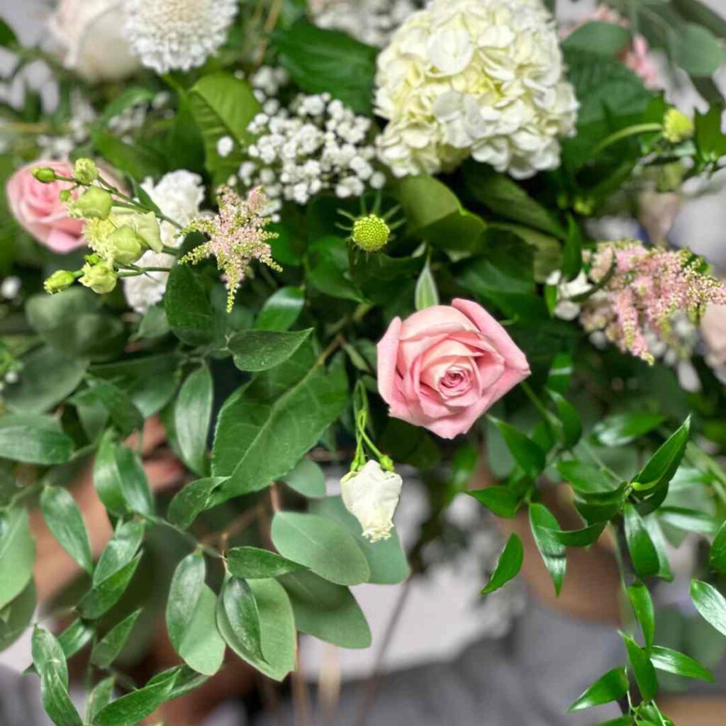Learn how to make a luscious bridal bouquet with garden roses, astilbe, hydrangea and spray roses in blush pink tones. Ideal to prepare for wedding season coming soon.