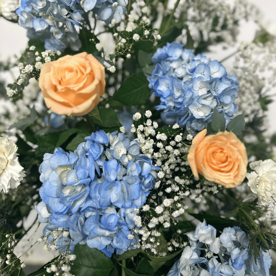 Read MoreBlue and Peach Pedestal Arrangement