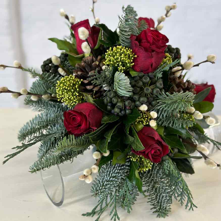 Learn how to create a seasonal bouquet with a holder; incorporate a selection of fresh flowers, foliage and dried products for this winter design.