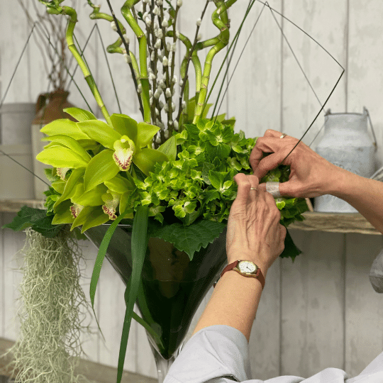 11 mins, 16 secs: Learn how to make a contemporary styled arrangement suited to a corporate setting in a reception offie space, hairdressers or car dealership.