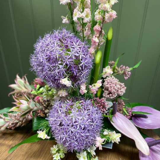 Time: 19 mins, 26 secs. Learn how to create a front facing traditional design using mini Ananas, Allium and Anthuriums for a corporate setting