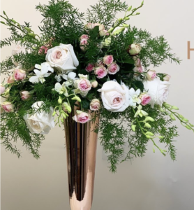 35 mins, 36 secs: Past Archive on how to make an arrangement in rose gold vase for wedding table centre.